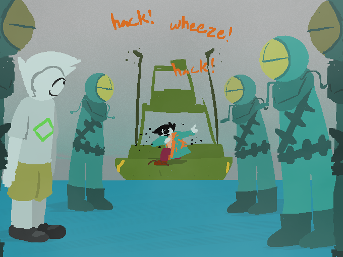 Embarrassingly, you break out into one of your coughing fits. Well, there goes standard procedure. CXKC CKXC!