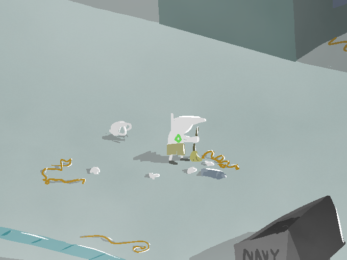 Rake, pile, wind. Rake, pile, wind. Over and over. It’s almost Zen. Or is it Sisyphean? You lose track of time and sink into introspection. Soon, that will be you. Working for the man, going nowhere. Working on metal ships, wearing a metal suit, living on a metal island, never experiencing the thrill of adventure or accomplishment. Nothing, nobody, forever.