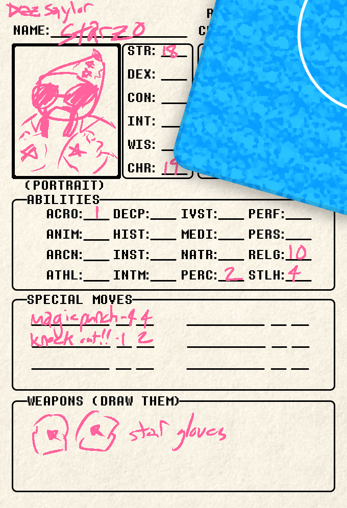 One of your newer sheets, but definitely not your newest. Starzo was an experiment of sorts, a test to see if you would enjoy a different playstyle than usual. You like the character, but you didn’t find him fun enough to warrant finishing his sheet. Though still, you rarely finish them anyhow.