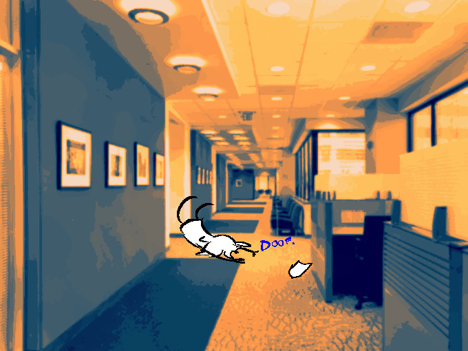 before you can even finish your sentence, he gets a bright look on his face and guides you to a nearby hallway. as he leaves, you trip and land on your face while hearing him say the office you're looking for is "that way". you presume he was pointing in one of two directions, but didn't bother to make sure you could see him do so? what a prick.