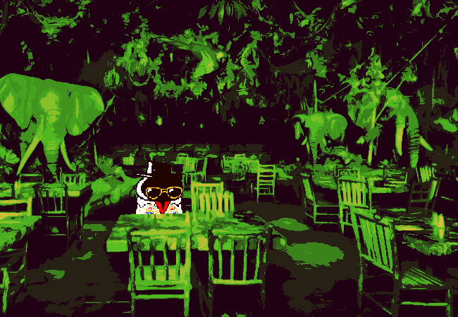 You seem to have found yourself in a cafe. From looking at the place, you can tell it has loads of class and atmosphere. You would be in awe of the auditory atmosphere too, were it not for your ELVIS COSTUME, which makes you unable to hear any of it. That elephant in the corner has been giving you the creeps! You do your best not to fall victim to its gaze a second time.
